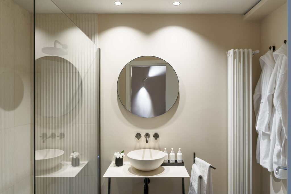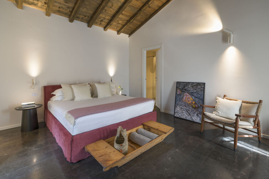 In pieno stile Dimora, le camere Superior sono moderne e colorate. Si aprono su un giardino privato ricco di piante mediterranee, che lo compongono come pezzi di un mosaico di colori.